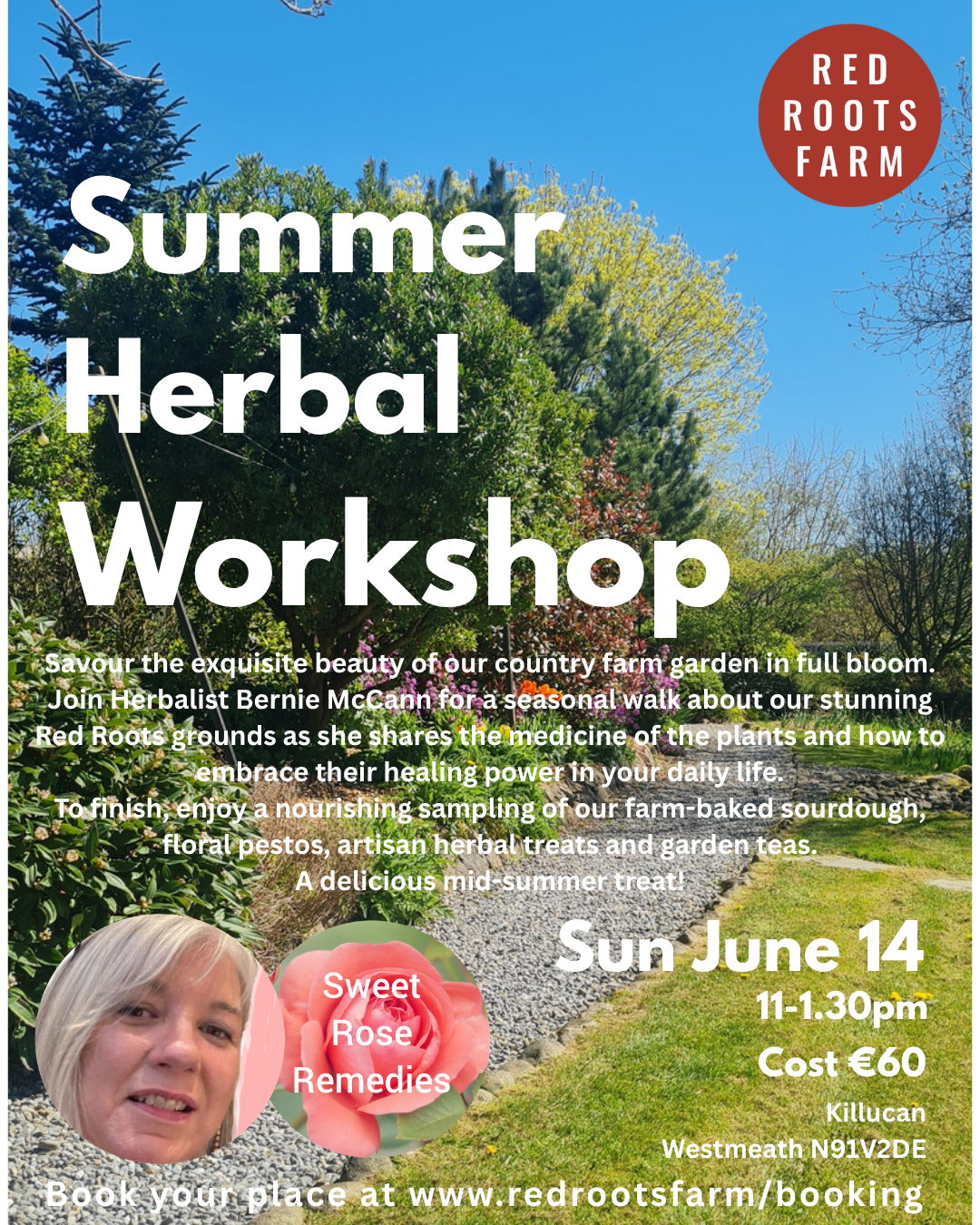 Join us for a nurturing walk and talk with Herbalist, Bernie McCann of Sweet Rose Remedies, through the gardens of Red Roots Farm to discover the healing bounty growing right on your doorstep. You will learn how to harvest seasonal flowers to create restorative teas that support your wellbeing and calm the body.